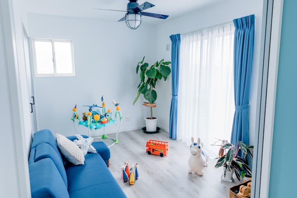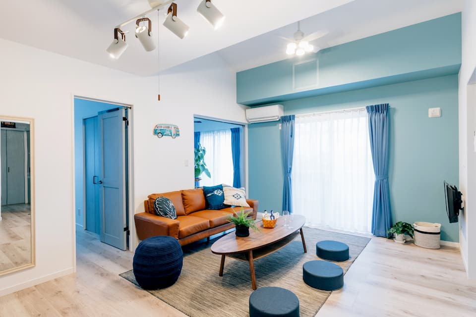 家具やインテリアは、美しい海や鮮やかな青空を感じさせるブルーでコーディネート。爽やかで落ち着きのある雰囲気になっております。